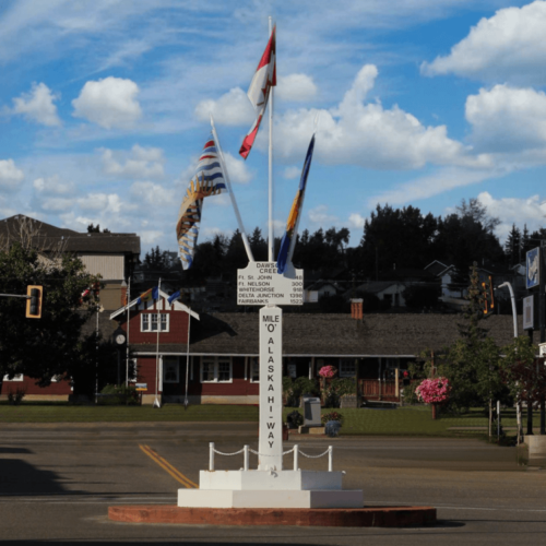 Travelling south westward through the Peace Country the highway crosses the Peace River at several locations. Dunvegan Bridge is another historic site with a campground and museum worth stopping at. At Rycroft, the Highway makes an abrupt turn to the west into BC. Check your fuel at Baytree just before the border. Dawson Creek is Mile Zero on the Alaska Highway which was hastily built during World War 2. Stop at the info centre on the east side of the city and learn more history of the Highway, possibly tour the Walter Wright Pioneer Village while in town.