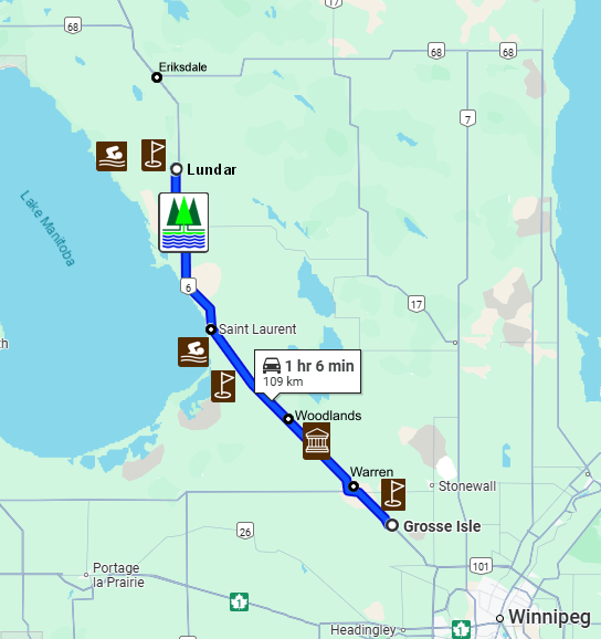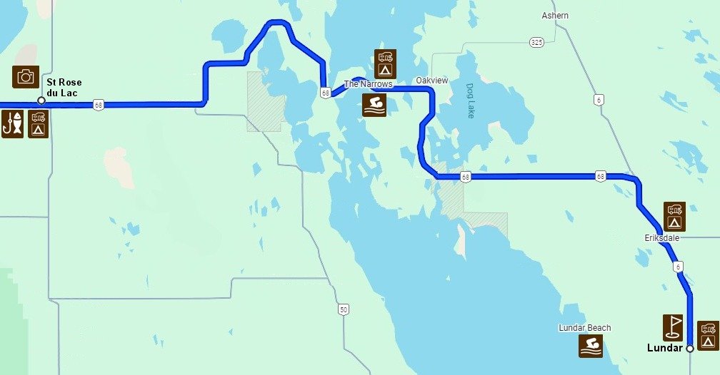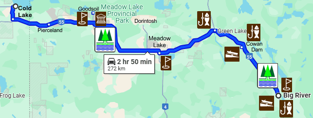The day's travels will include numerous lakes. If you would like to spend a litle bit of time fishing from shore, Cowan Dam north of Big River is a great place to pull off the highway and take some casts. Cowan Dam is what creates Cowan Lake, known for it's Northern Pike and Walleye fishing, similar to Green Lake where the highway turns west into Meadow Lake. The forestry industry is obvious in this region. Northwest of Meadow Lake is Meadow Lake Provincial Park with multiple lakes for swimming, fishing, water skiing, and beach time. Goodsoil is near the west entrance to the Park. Northern Meadows and Meadow Lake have excellent 18 hole golf courses. We will be camping at Northern Meadows.