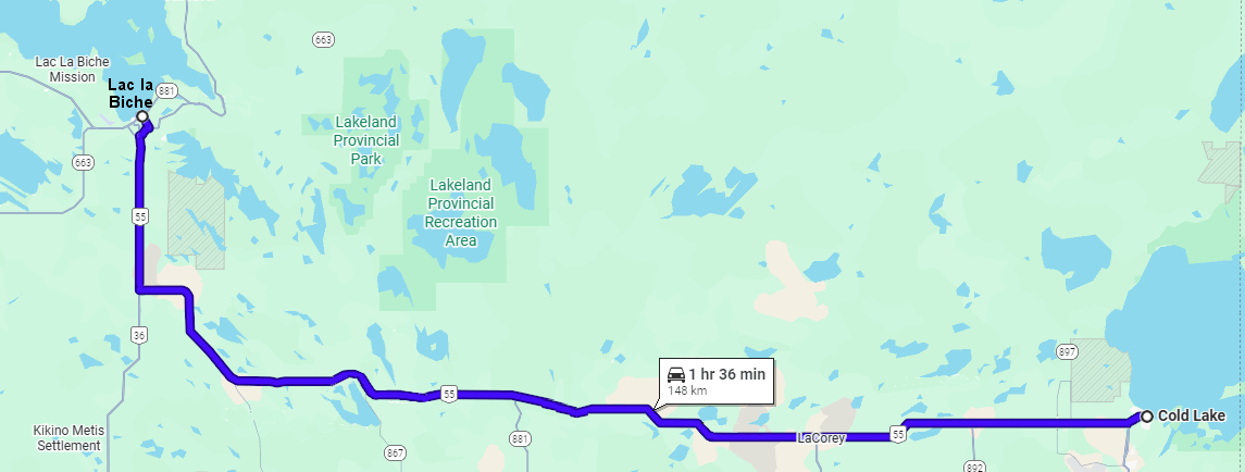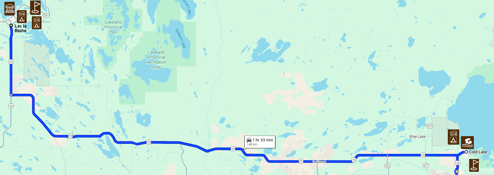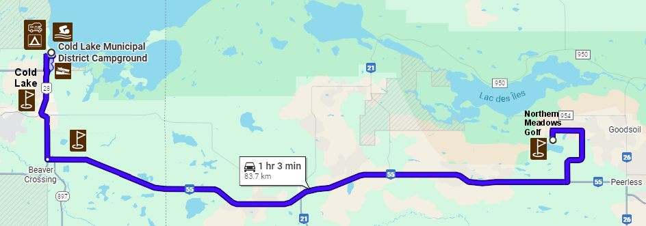 It is just a short hop from Northern Meadows Golf Course across the border into Alberta and the City of Cold Lake. Cold Lake is home to CFB 4 Wing, one of Canada's fighter bases and pilot training facilities. The community is an amalgamation of 3 communities, Cold Lake, Grand Centre and Medley. Cold Lake North has camping, a beach and a marina. There is a museum at the top of the hill between the two residential areas that showcases the military history as well as First Nations and the Oil & Gas Industry. There should be lots of time for relaxing here today, or exploring around the town.
