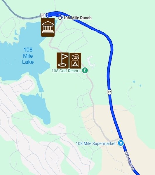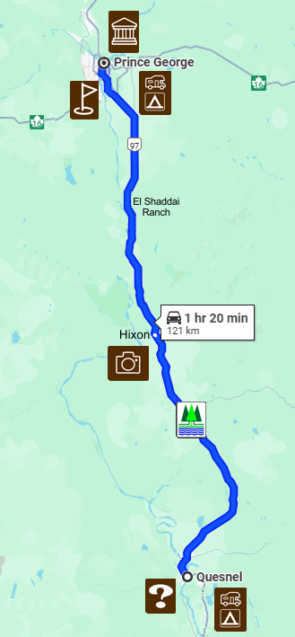 The day's travel is through the historic Cariboo Gold Rush area. Travel through Clinton, past the Chasm Ecological Reserve, then 70, 100, 108, Mile Houses. The various communities with Mile in their name are based on the distance from Lillooet, Mile zero of the Cariboo Wagon Road. They were stops to change horses, rest, and grab some grub. There is a great golf course at 108 ranch.