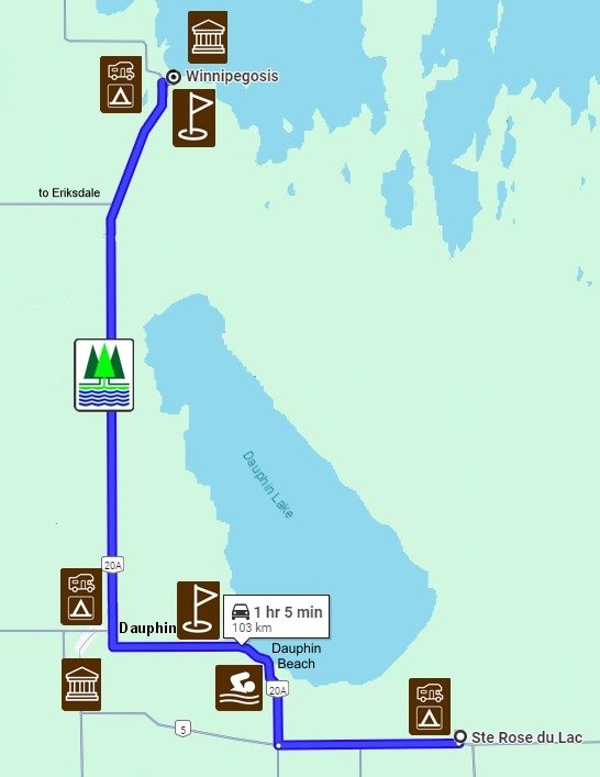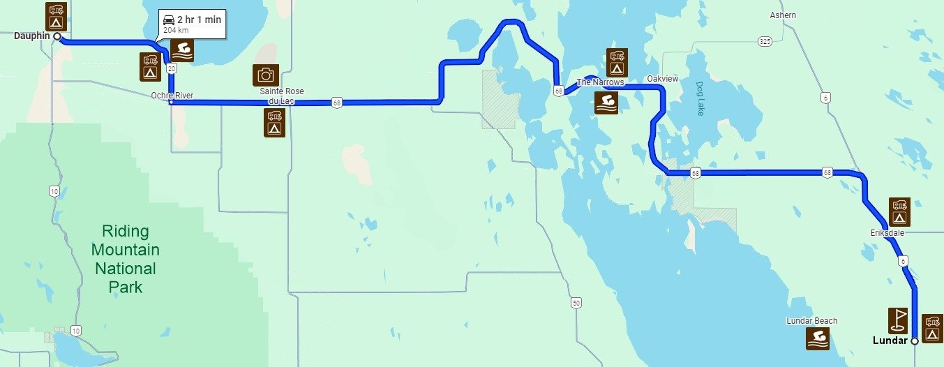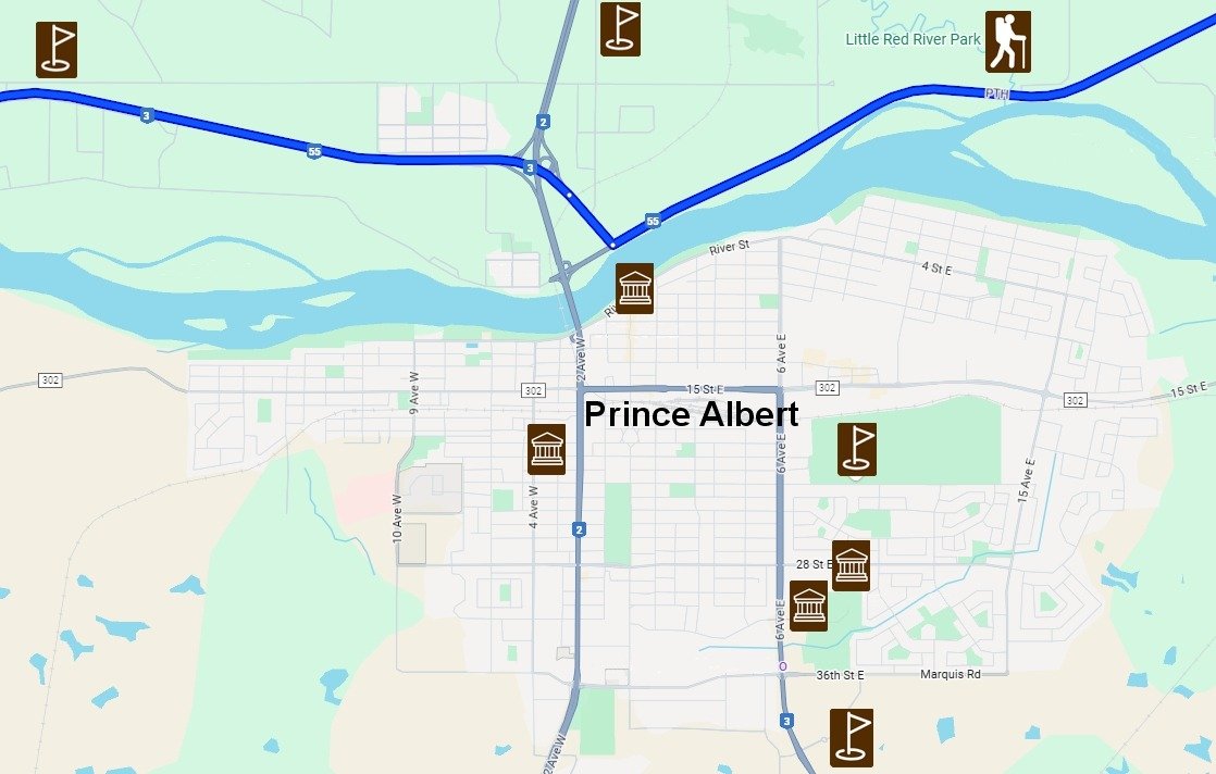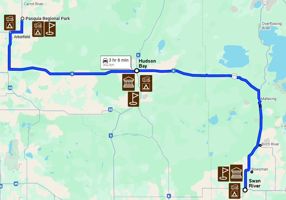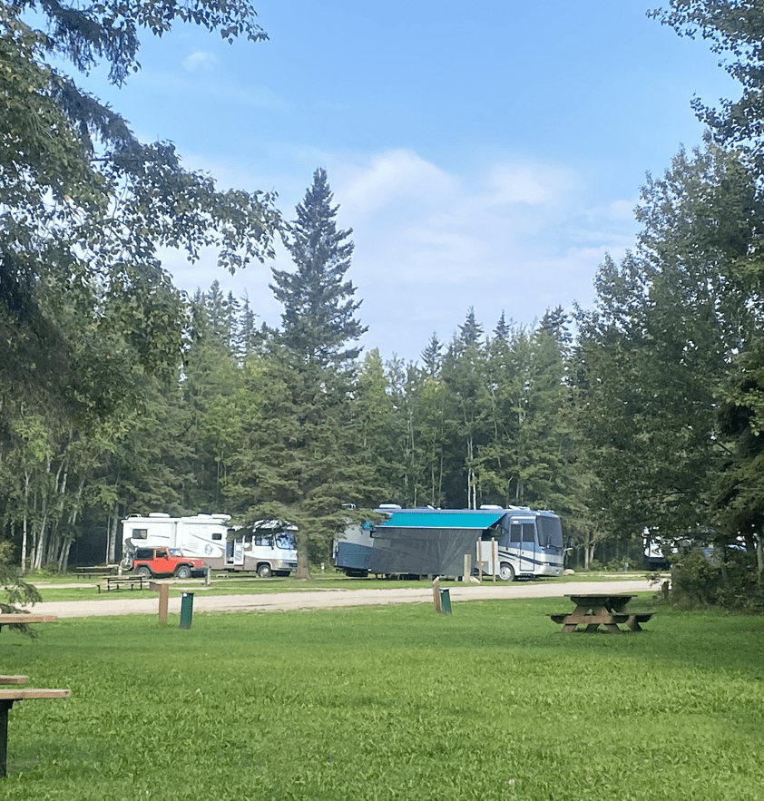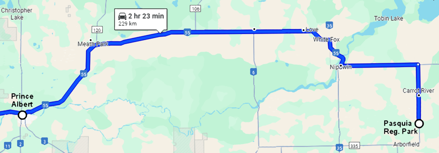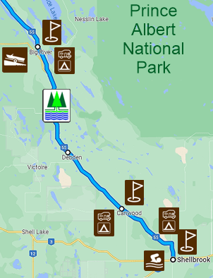 From Prince Albert, we continue along Hwy 55 to Shellbrook where we head north approx 5 km before the highway turns north west to Canwood. The Canwood Regional Park has a great little 9 hole golf course, but watch out with bigger units as the parking lot is small. Just SW of Debden is a great beach on Morin Lake but the road is gravel. North of Debden the highway goes through the forest. Big River is next on this NW trek. We will be camping at the Big River Regional Park. The next day starts out with a trail ride into the west side of Prince Albert National Park, the hope is to encounter a free roaming herd of wood buffalo. After the ride we mount up the RVs for our drive to Northern Meadows Golf Resort west of Goodsoil for the evening and supper. From Goodsoil to Northern Meadows is a few kms on a gravel road.