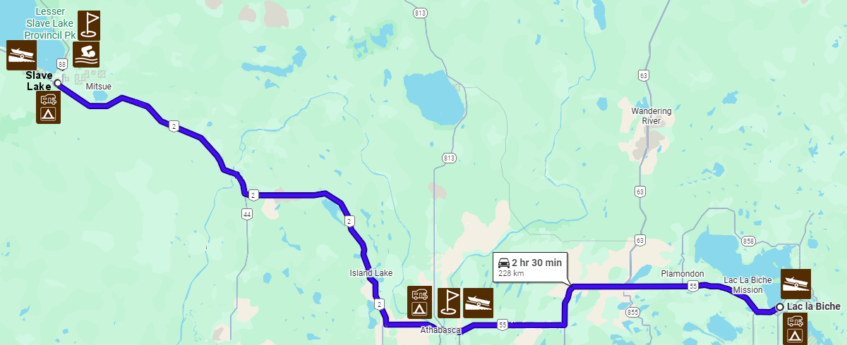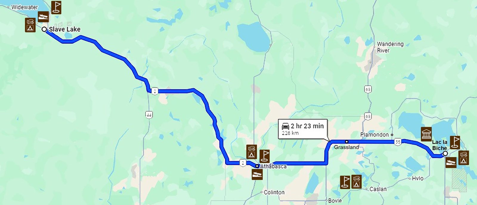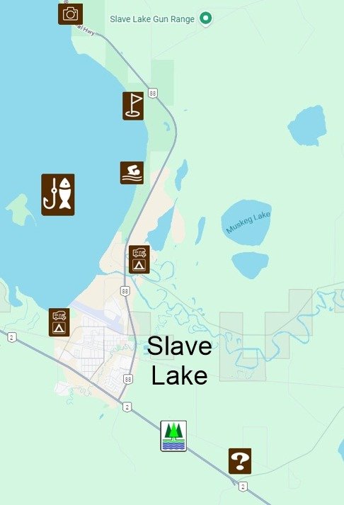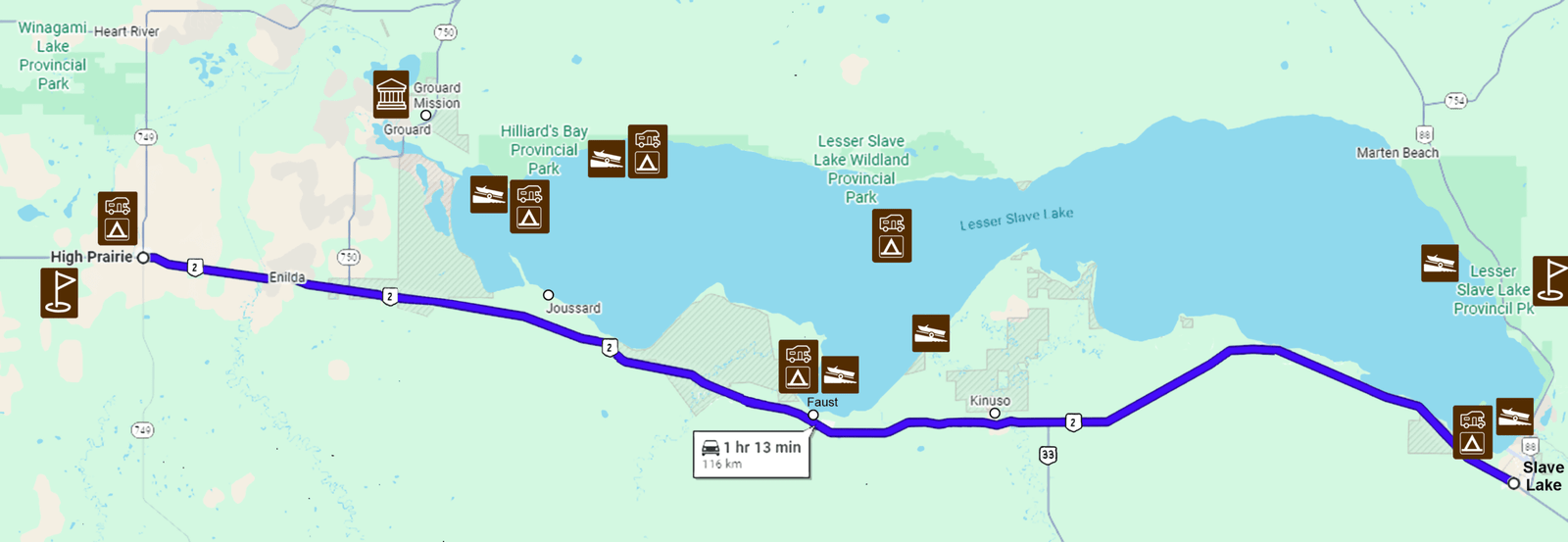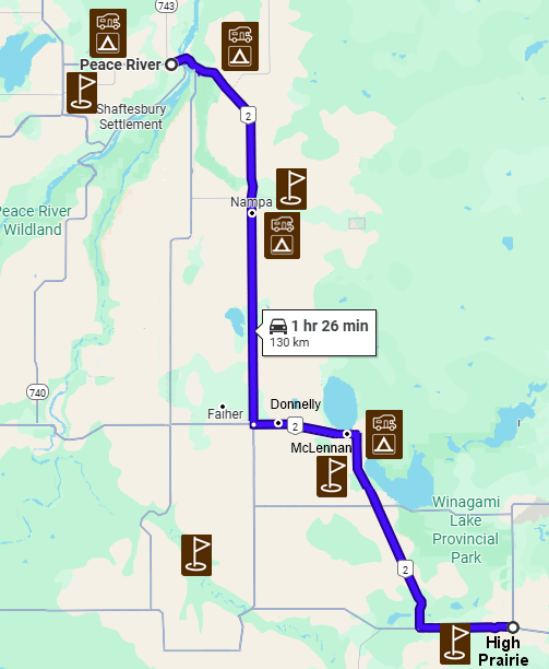 High Prairie is the east access to the rich agricultural region of NW Alberta and NE BC known as the Peace Country because of the Peace River that runs through the region before turning north into the Slave River then onto Great Slave Lake and the Arctic Ocean. This region gets extended hours of sunlight during the summer but less in the winter due to its location. Primarily an agricultural region but in recent years the oil & gas and forestry industries have become more important economic drivers of the region. The travel day will skirt the southern shores of Lesser Slave Lake, the 2nd largest lake in Alberta. The lake is 82 kms long x 20 kms at its widest point. It is full of fish, has great beaches and a multiude of campgrounds along the southern shores. There is history of the fur trade starting from the northwest corner and the Peace River Trail. There are two native reserves west of Slave Lake that we will pass through today.