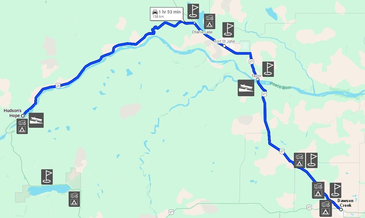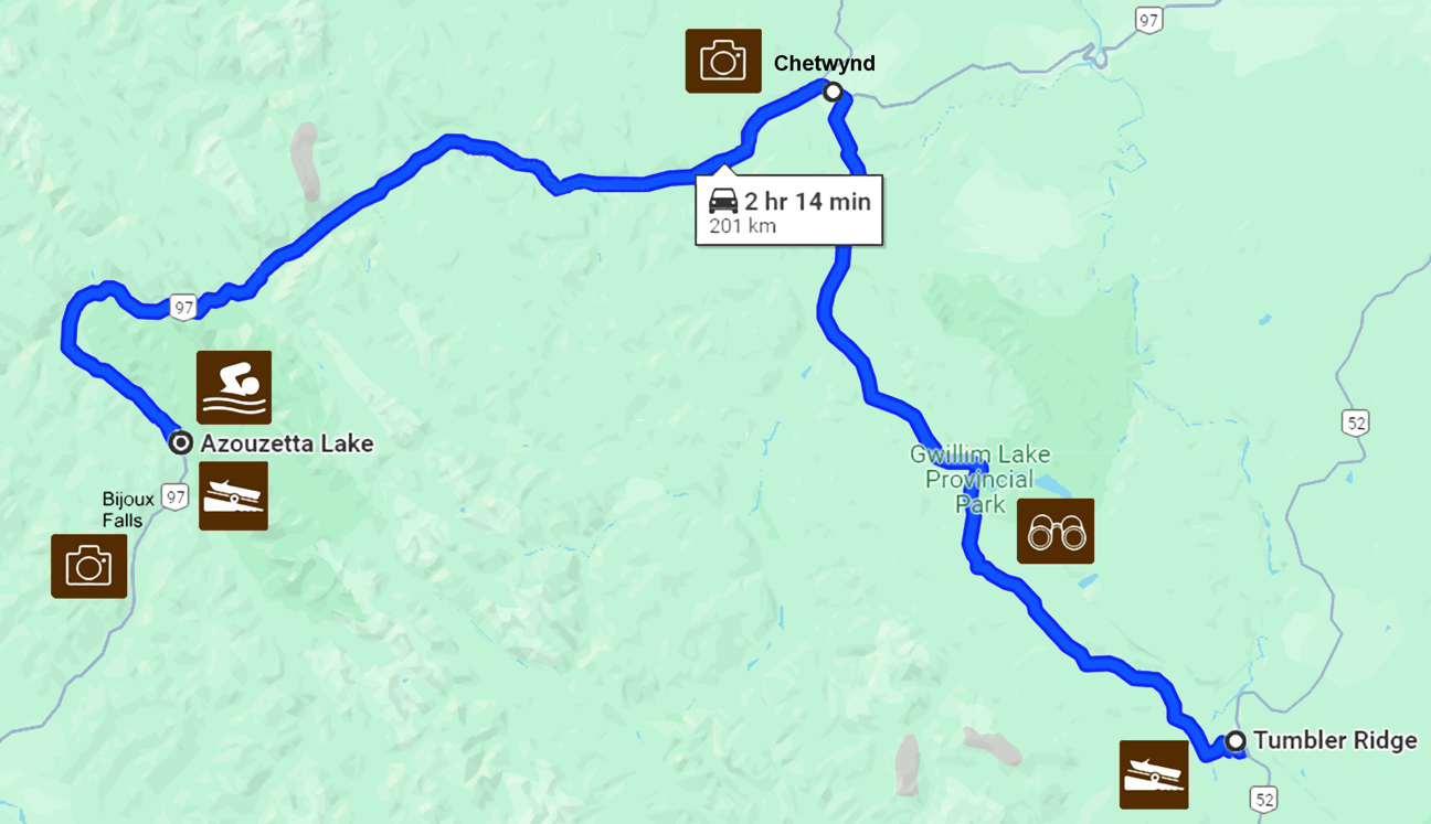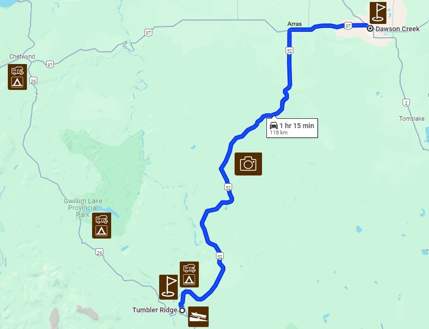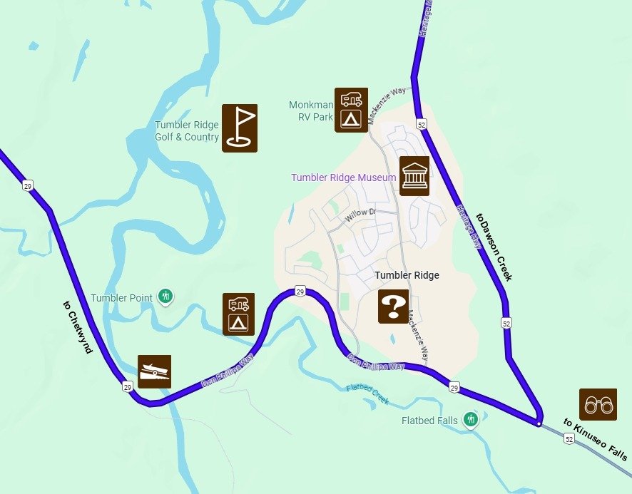 We start south on Highway #97, travel 21 km to the junction of Hwy #57 to Tumbler Ridge. This road is paved but has lots of elevation changes as we head into the Rocky Mountains. After finishing in Tumbler Ridge we will travel northwest on Hwy 29 past Gwillim Lake Provincial Park to Chetwynd . Tumbler Ridge has lots of hiking trails and waterfalls in the area as well as a great museum and golf course. The region has been recognized as a Global Geo Park. The town was originally developed as a planned community to support the coal mining industrywhich has several mines in the region.