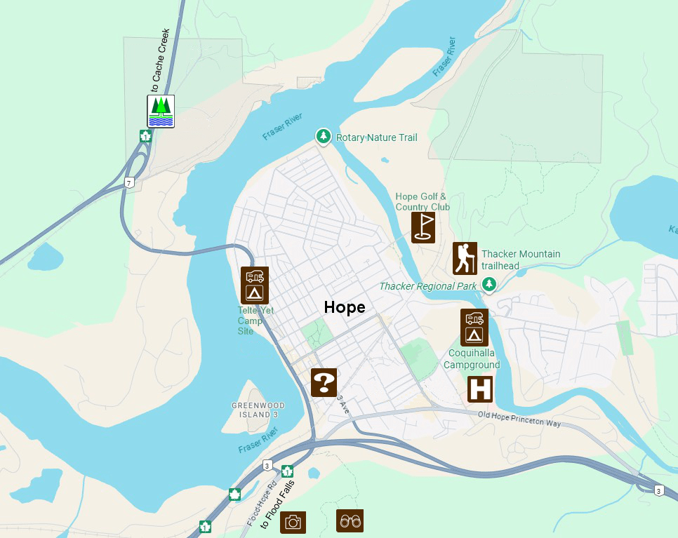 The Fraser River passes through town and the junction of three highways: Hwy #1 from the Fraser Canyon, Hwy #5 Coquihalla, and Hwy #3 Crowsnest. The Sylvester Stallone movie Rambo - First Blood was shot in Hope and there are still movie fans coming to Hope to see where some of the scenes were shot.