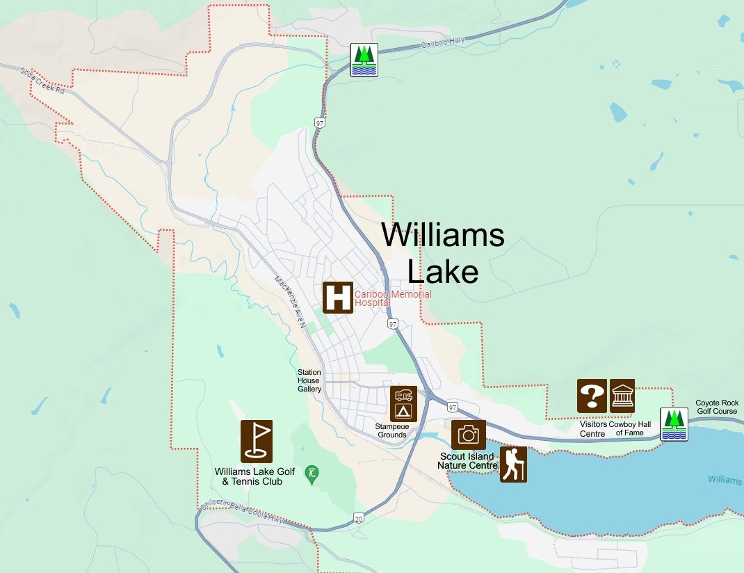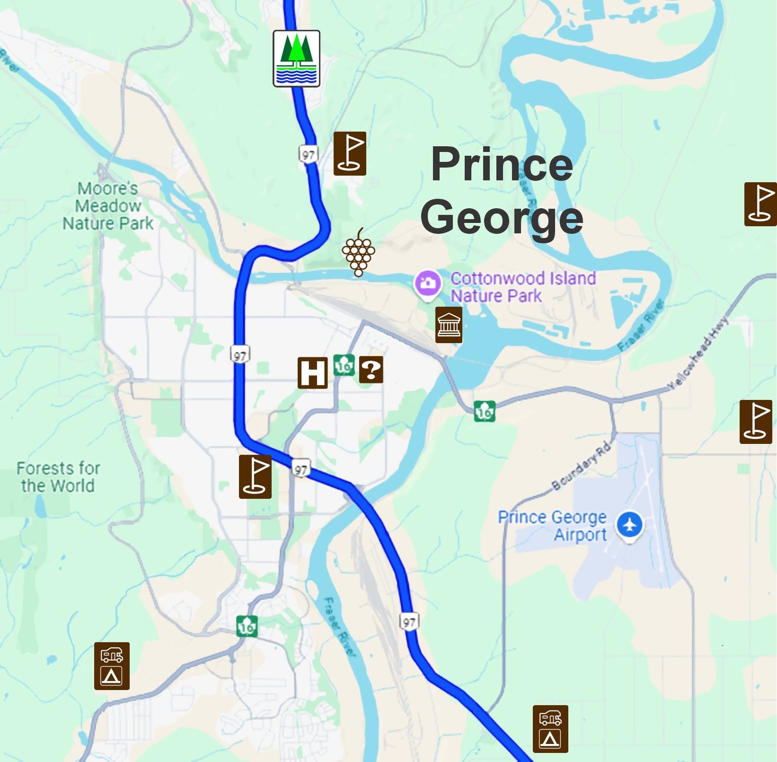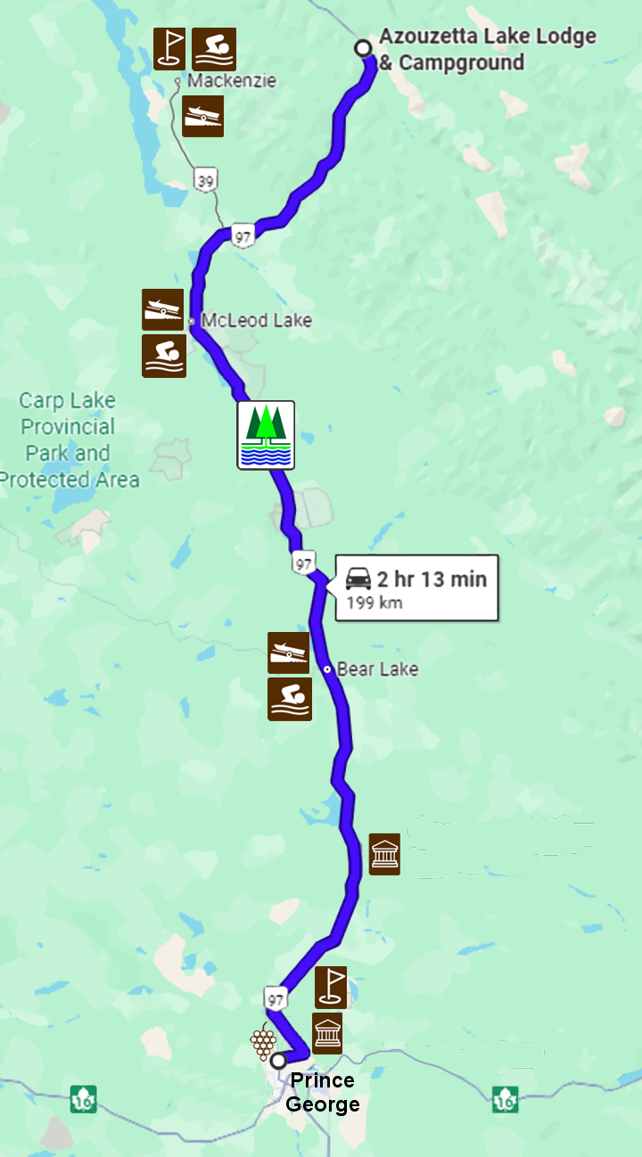 From Azouzetta we continue through the Pine Pass, a scenic drive running alongside the Pine River. There isn't a lot of people living along this picturesque drive. Prince George is located at the junction of Yellowhead and NWW Highways with the Yellowhead being the connection to the West Coast at Prince Rupert. Prince George is the largest community along the Northern Woods & Water Highway. It has a forest based economy and is a logistics hub for the rail industry. The Central BC Railway and Forestry Museum is located in the City near the confluence of the Nechako and Fraser Rivers. There is a winery in the city that you can go to enjoy a tasting. The Fraser River passes through the city as it turns southward to the coast. The NWW Highway will follow along the eastern banks of the Fraser, darting in and out until just north of Williams Lake.